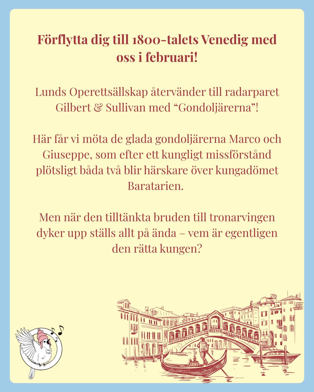 Det är därför både sensationellt och beundransvärt att Lunds Operettsällskap de senaste åren med stor framgång har producerat två sådana; Piraterna från Penzance och Iolanthe. Och en tredje - Gondoljärerna - är nu i vardande. Premiär i februari 2026. Försäljningen av biljetter till Gondoljärerna startar den 30 oktober 2025 på www.nortic.se.