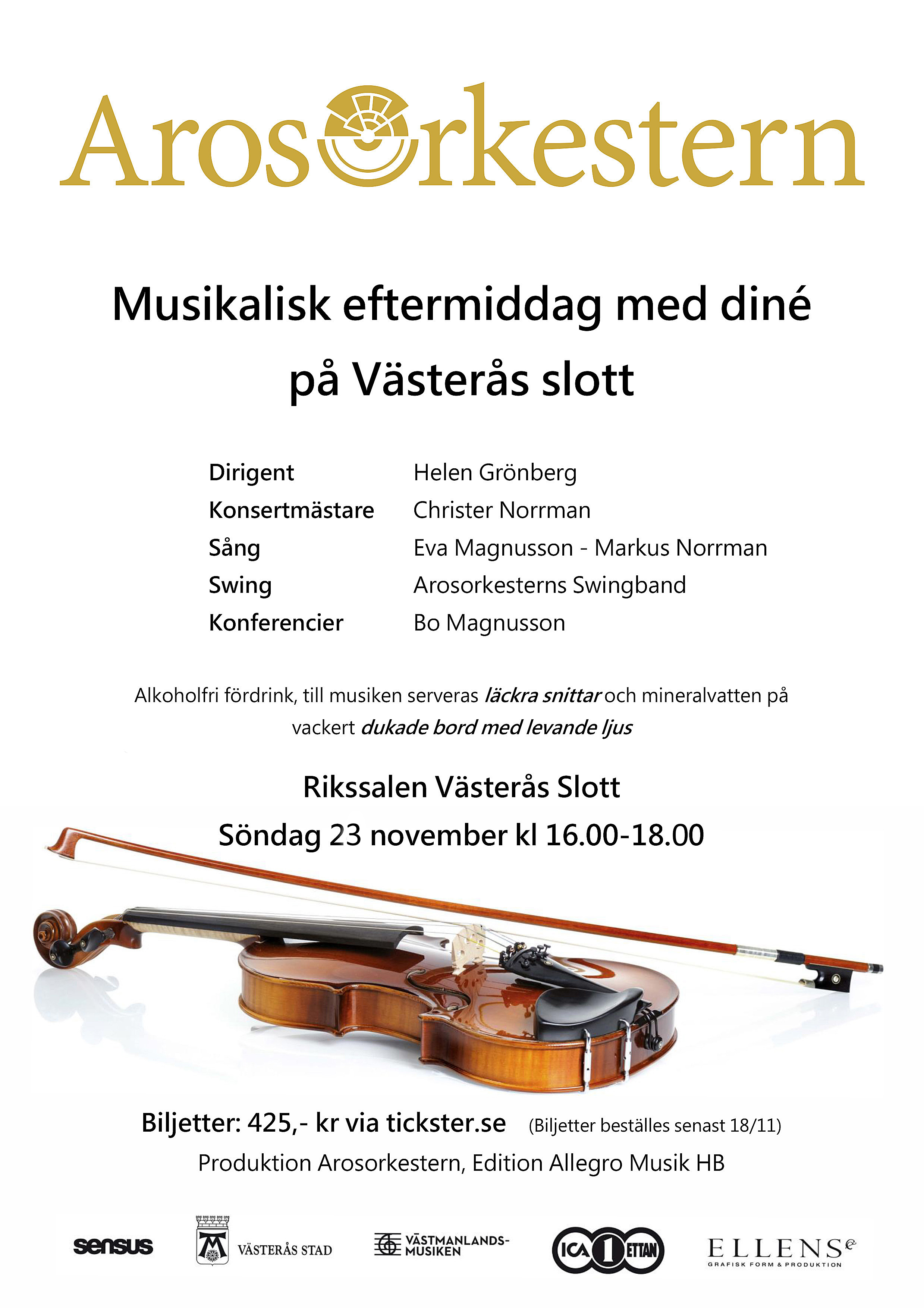 I den magnifika och anrika Rikssalen på Västerås Slott stundar en av höstens stora konsertbegivenheter! En glittrande musikalisk eftermiddag med den symfoniska Arosorkestern i vänlig wiensk anda och med anledning av minnesår hyllning av kompositörerna Johann Strauss d y och Robert Stolz. Därtill svängig jazz med Arosorkesterns Swingband. Och musiken den avnjuts tillsammans med en av källarmästaren anrättad tallrik med läckra snittar serverad på vackert dukade bord med levande ljus. Sångsolister: Eva Magnusson, sopran och Markus Norrman, baryton. Dirigent: Helen Grönberg. Konsertmästare: Christer Norrman.